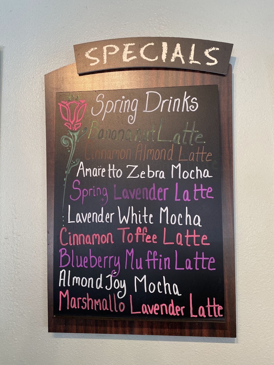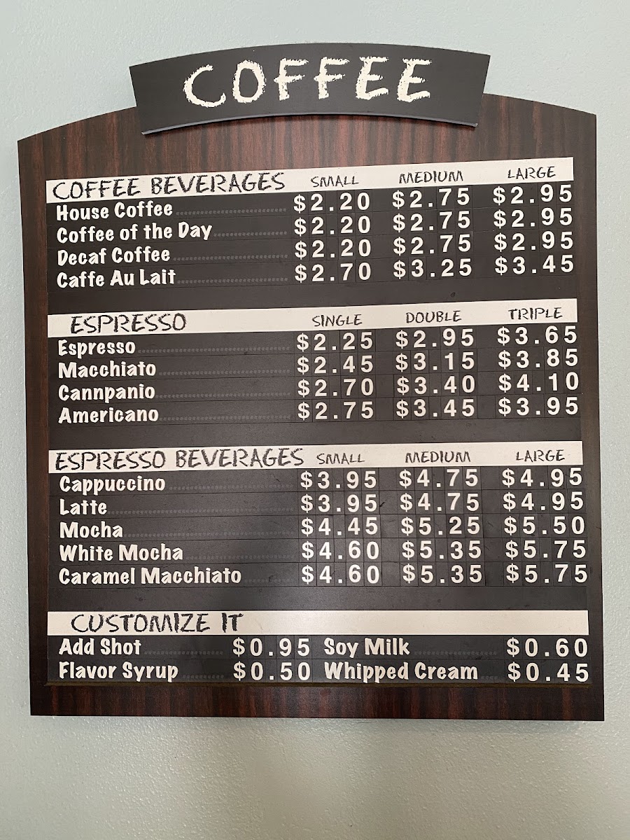 - Coffee and Specialty Drinks: Drip coffee, espresso, lattes with diverse flavors, cold brew, iced coffees, and smoothies.